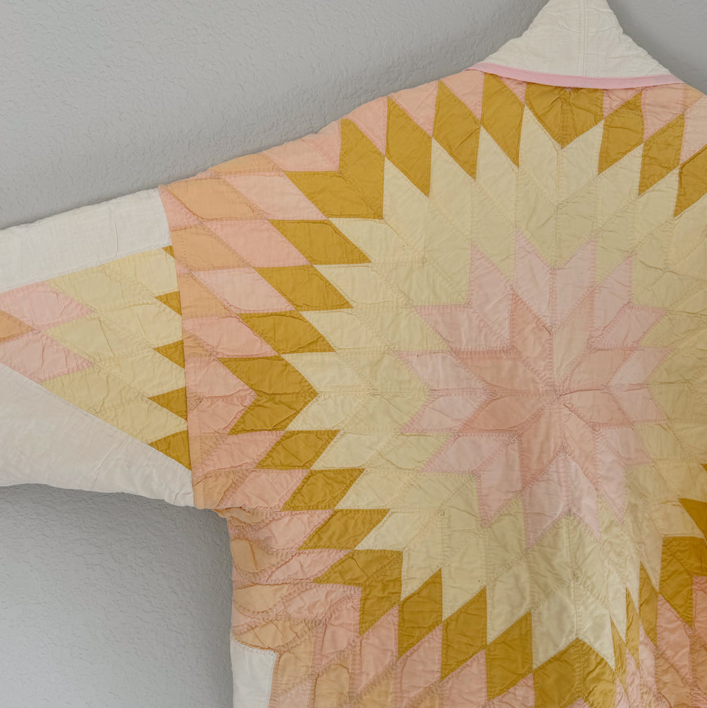 This is an American antique quilt made in 1932! This is a stunning Lone Star pattern, a true geometric classic! This quilt is hand quilted and hand pieced with beautiful pastels in pinks and yellow cotton fabrics. This quilt is thin, lightweight, and has a little loft. The backing is a beautiful creamy white. If you have further questions, please direct message us and we are happy to send you a video.