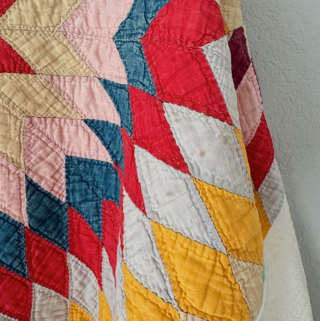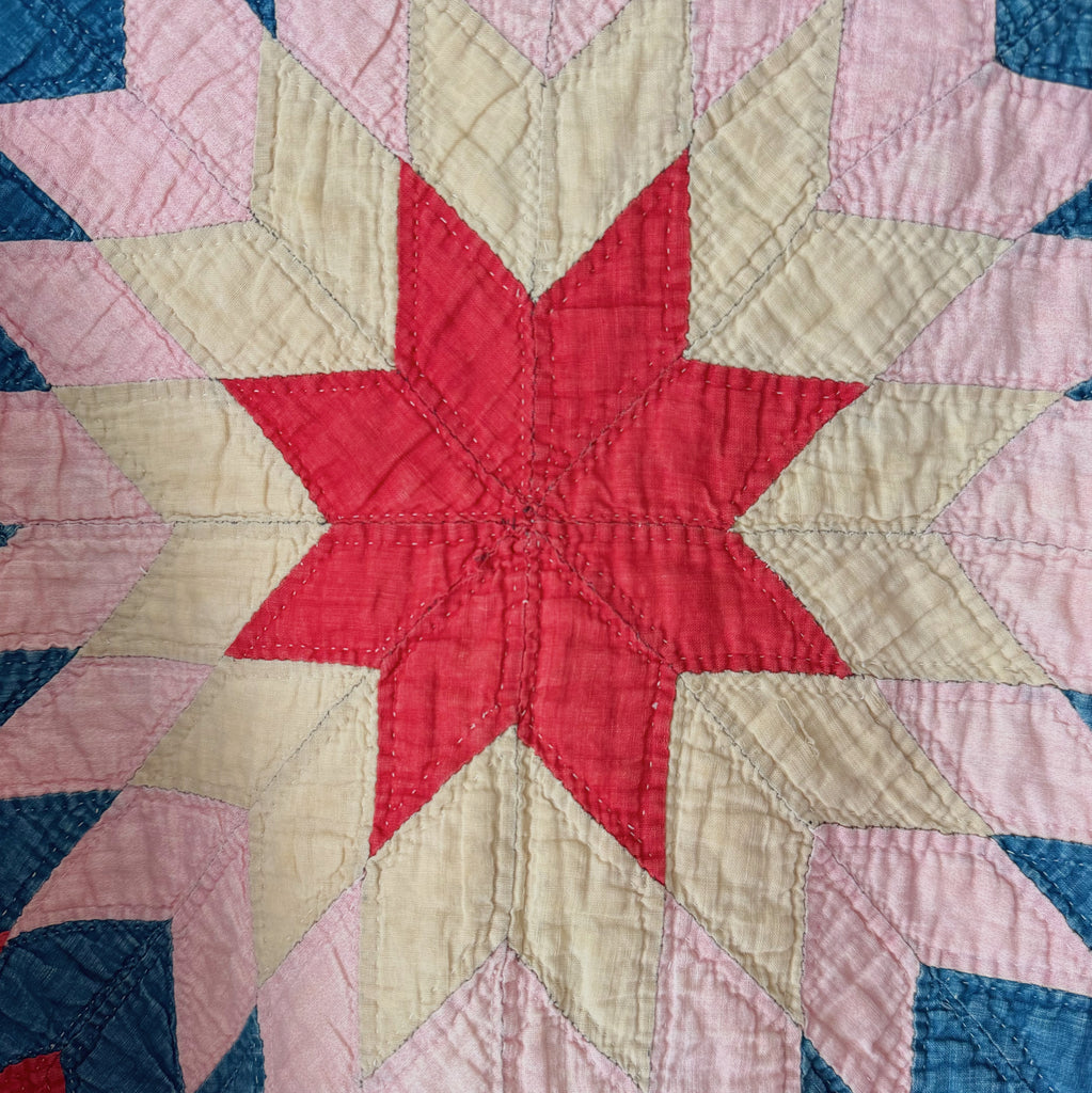 This is an American antique quilt made in circa 1935-40s. This is a gorgeous Lone Star pattern. Hand quilted and hand pieced with a beautiful jewel tone palette. This quilt is thin, lightweight, and has a little loft. The backing is a beautiful creamy white. If you have further questions, please direct message us and we are happy to send you a video.