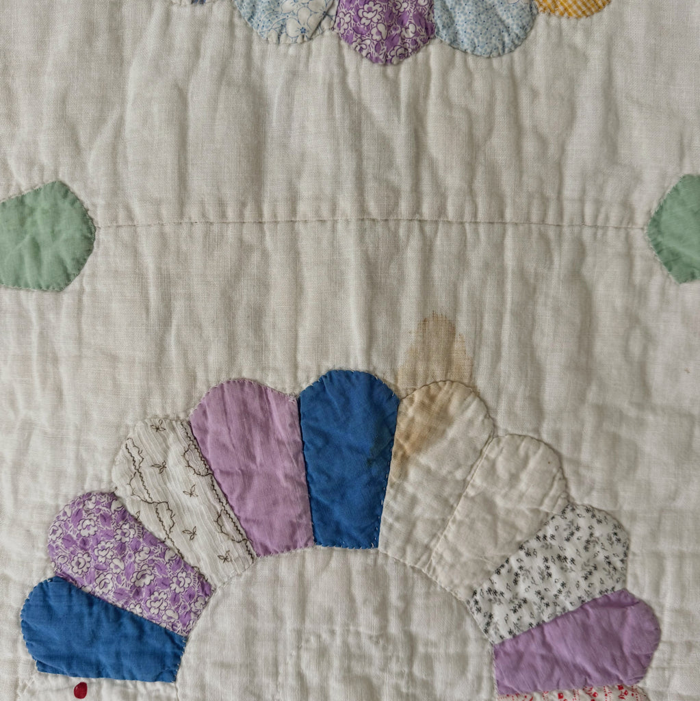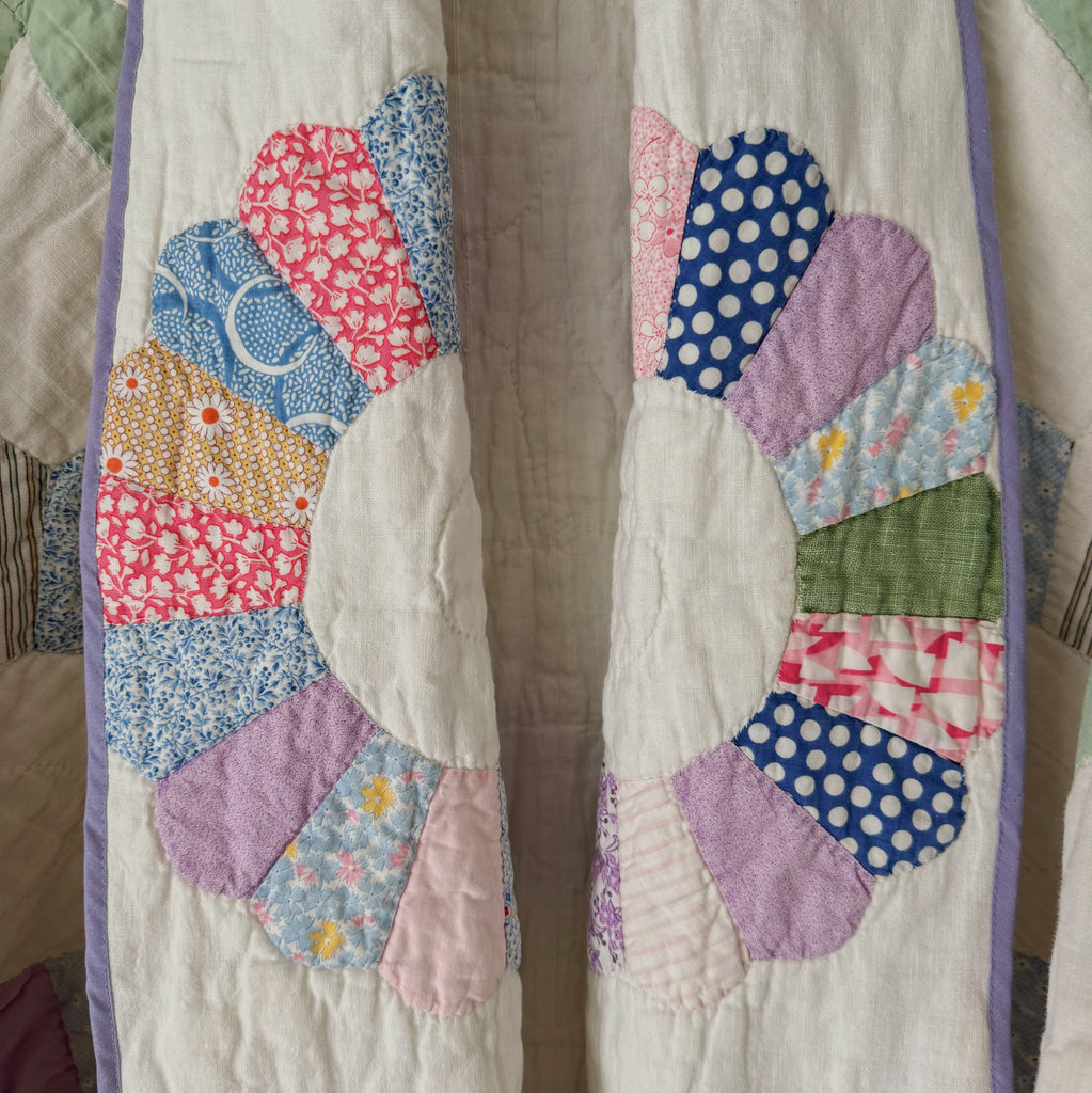 This quilt is an incredible example of an appliquéd Dresden Plate quilt with alternating clover-form floral blocks, pieced and quilted by hand, composed of Depression-era cotton prints and feedsack fabrics. Likely Midwest, circa 1930–1945.