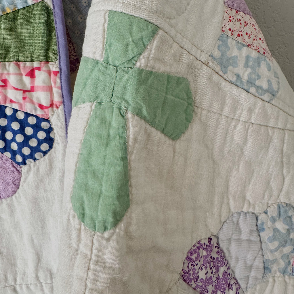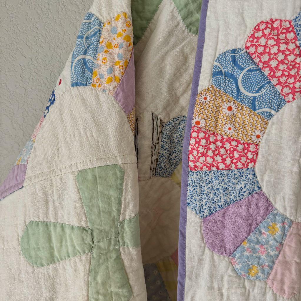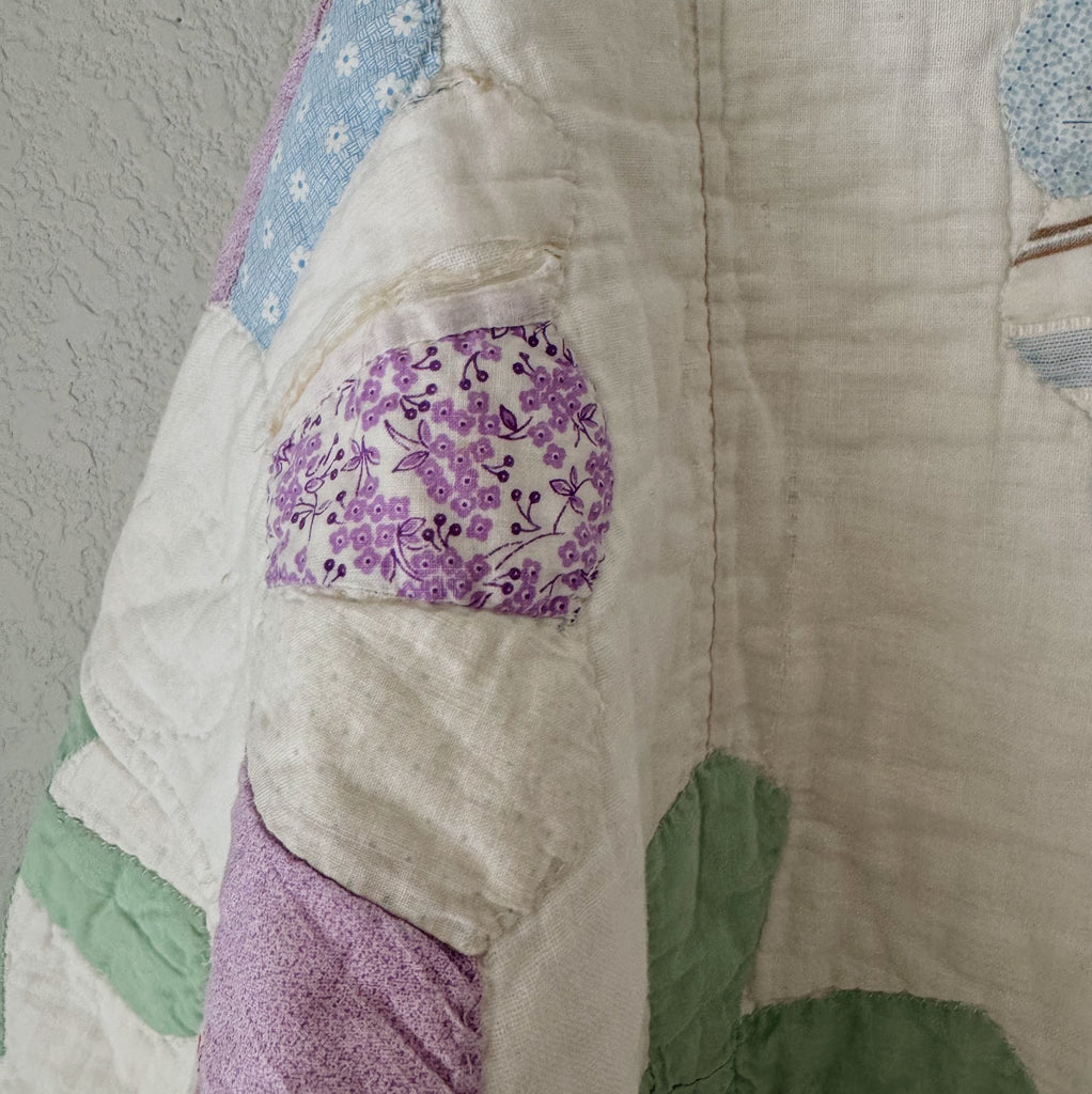 Hand quilted and hand pieced with a beautiful pastel palette. This quilt is a bit thicker, lightweight, and has a little loft. The backing is a beautiful creamy white. If you have further questions, please direct message us and we are happy to send you a video.