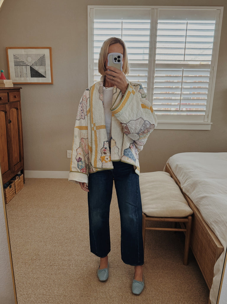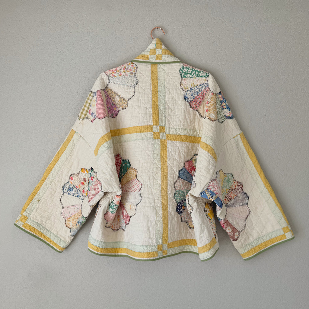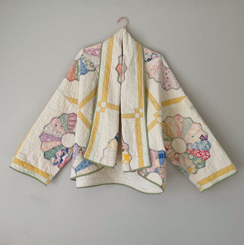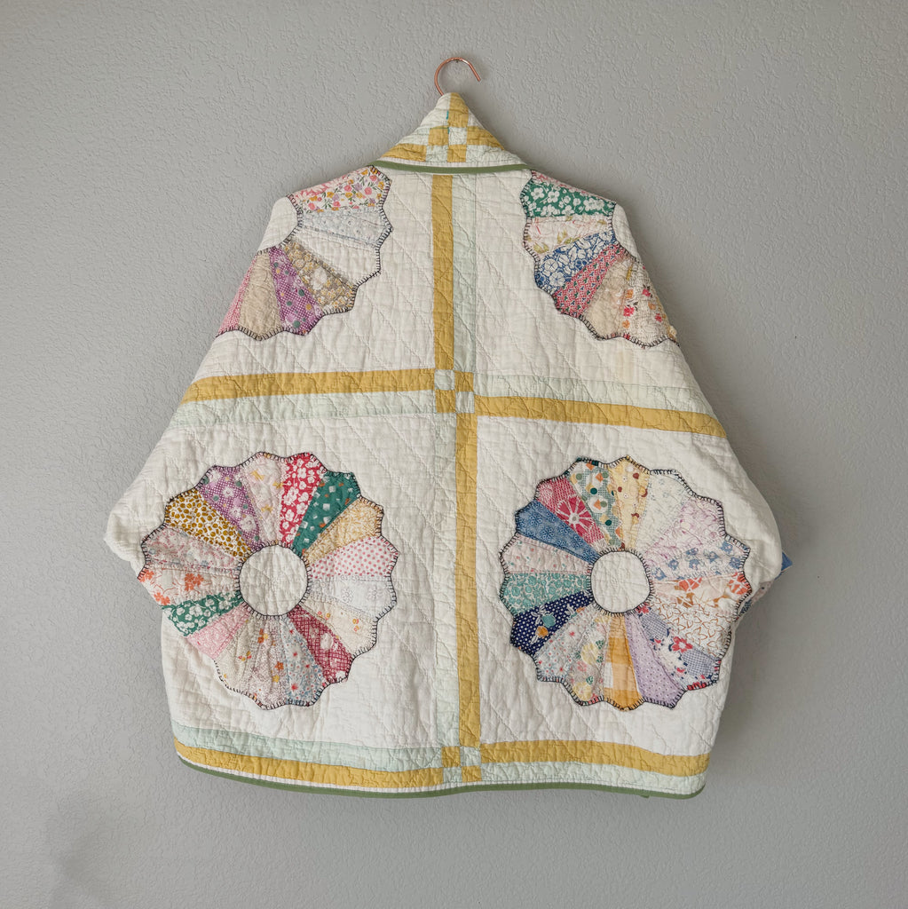 Please note that all of our jackets are made from antique quilts and the fabric reflects this. Our fabrics are sometimes older than 100 years and we believe that makes them perfectly imperfect. We recommend spot cleaning if necessary.
