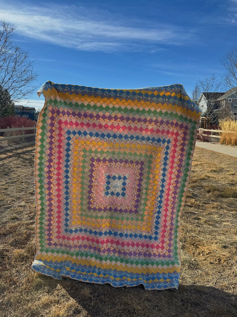 This is a classic Trip around the World pattern. This quilt is hand quilted and hand pieced with beautiful bold and pastel colors. This quilt is thin, lightweight, and has a little loft. The backing is a lovely blue floral (see photos). If you have further questions, please direct message us and we are happy to send you a video.