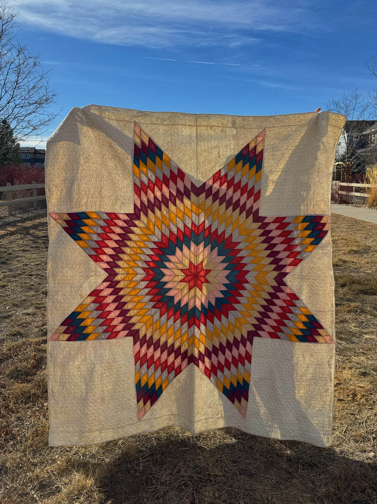 This is an American antique quilt made in circa 1935-40s. This is a gorgeous Lone Star pattern. Hand quilted and hand pieced with a beautiful jewel tone palette. This quilt is thin, lightweight, and has a little loft. The backing is a beautiful creamy white. If you have further questions, please direct message us and we are happy to send you a video.