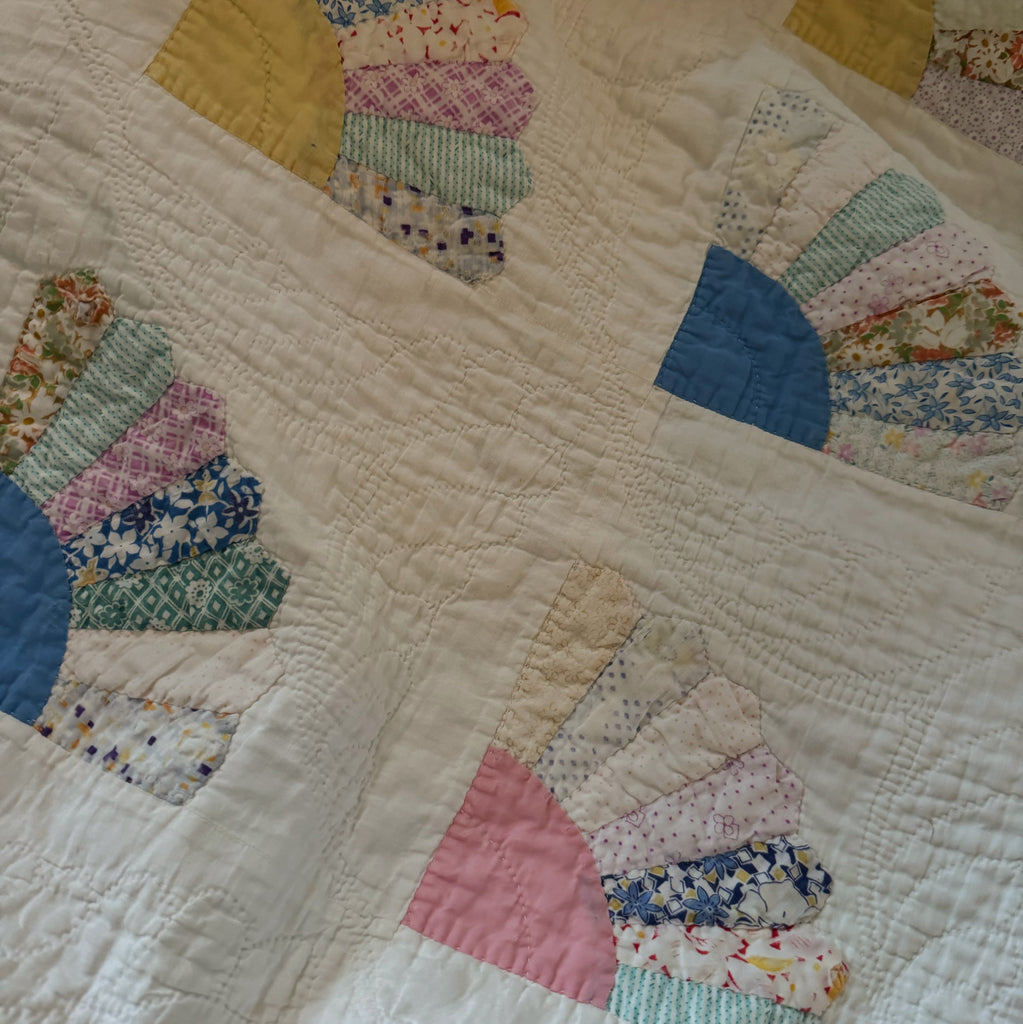 This quilt is made in a Fan, or Half Dresden Plate, pattern using small pieces of printed cotton fabric arranged in curved shapes. It was likely made between 1925 and 1940, a time when Dresden-style quilts were very popular in the United States. The soft pastel colors and delicate hand stitching reflect everyday fabrics and careful home craftsmanship of the era. Quilts like this were often created from fabric scraps and used both as warm bedcovers and as decorative expressions of creativity in the home.