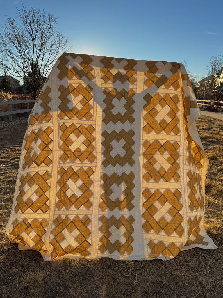 Hand quilted and hand pieced with a beautiful neutral palette. This quilt is a thick, and has quite a bit of loft. The backing is a beautiful creamy white . If you have further questions, please direct message us and we are happy to send you a video.
